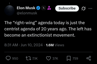Elon Musk a écrit sur X : « L’agenda ‘de droite’ d’aujourd’hui n’est que l’agenda centriste d’il y a 20 ans. La gauche est devenue un mouvement d’extinction. »