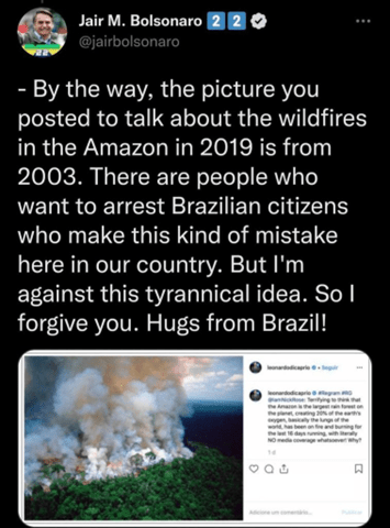 Certains médias ont exagéré en utilisant des images datant de 2003 pour discréditer Bolsonaro, comme dénoncé dans un tweet à Leonardo DiCaprio en 2019.